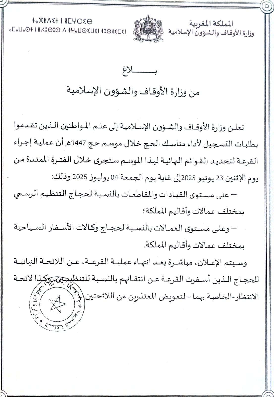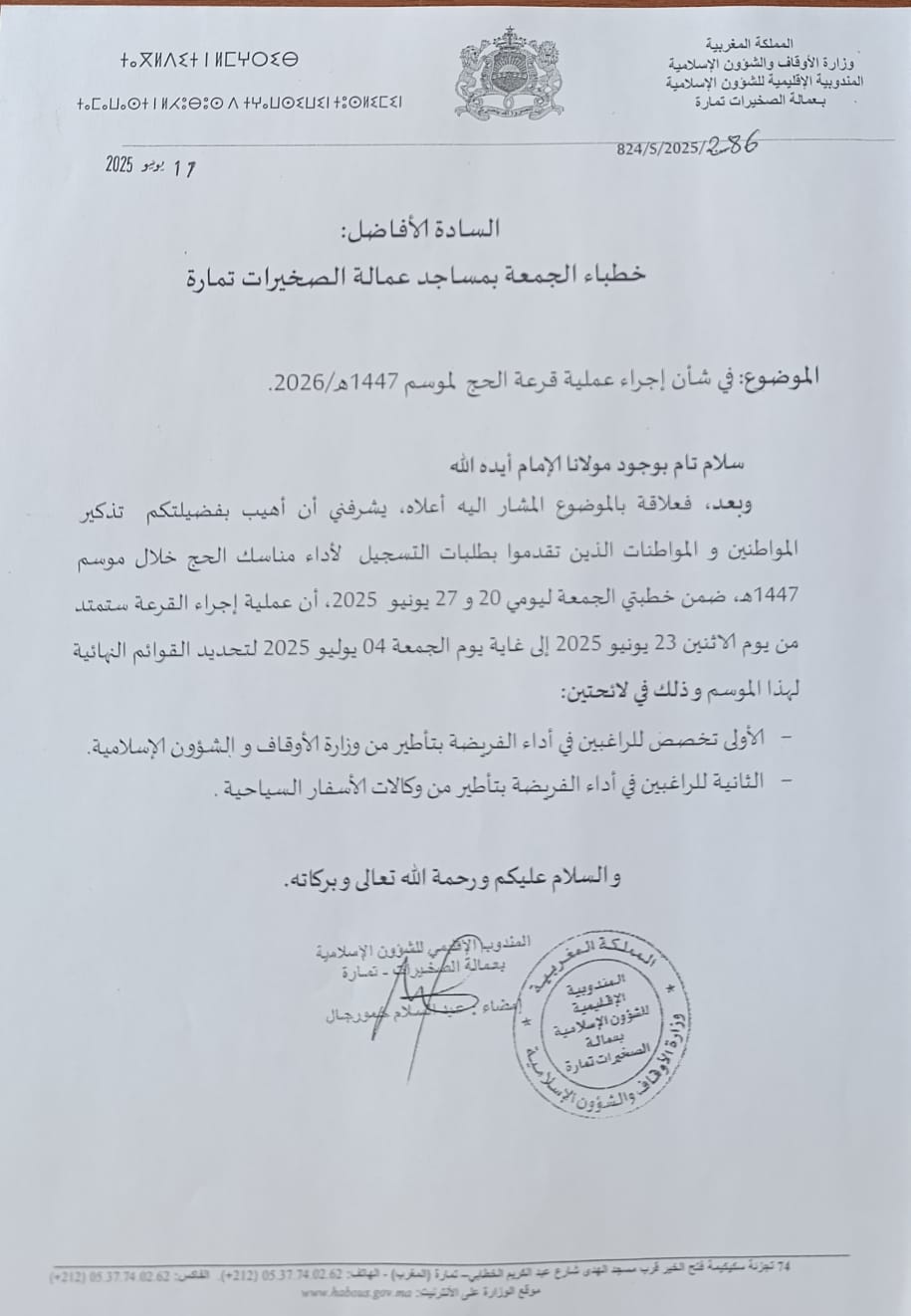 اجراء عملية قرعة الحج لموسم 1447ه/2026 أخبار عامة إعلانات الرئيسية jeu 23 ذو الحجة 1446AH 19-6-2025AD